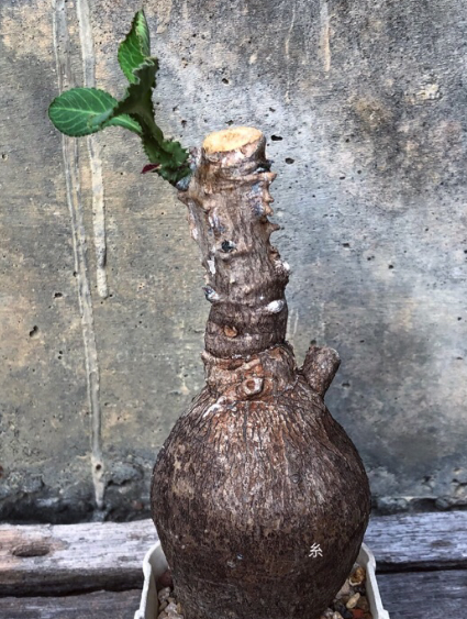 Growing in a well drained soil with some water and some sun. The caudex can grow to eight centimetres in diameter, the whole plant up to 1,5 meters height. The flowers are dark pink and greenish.