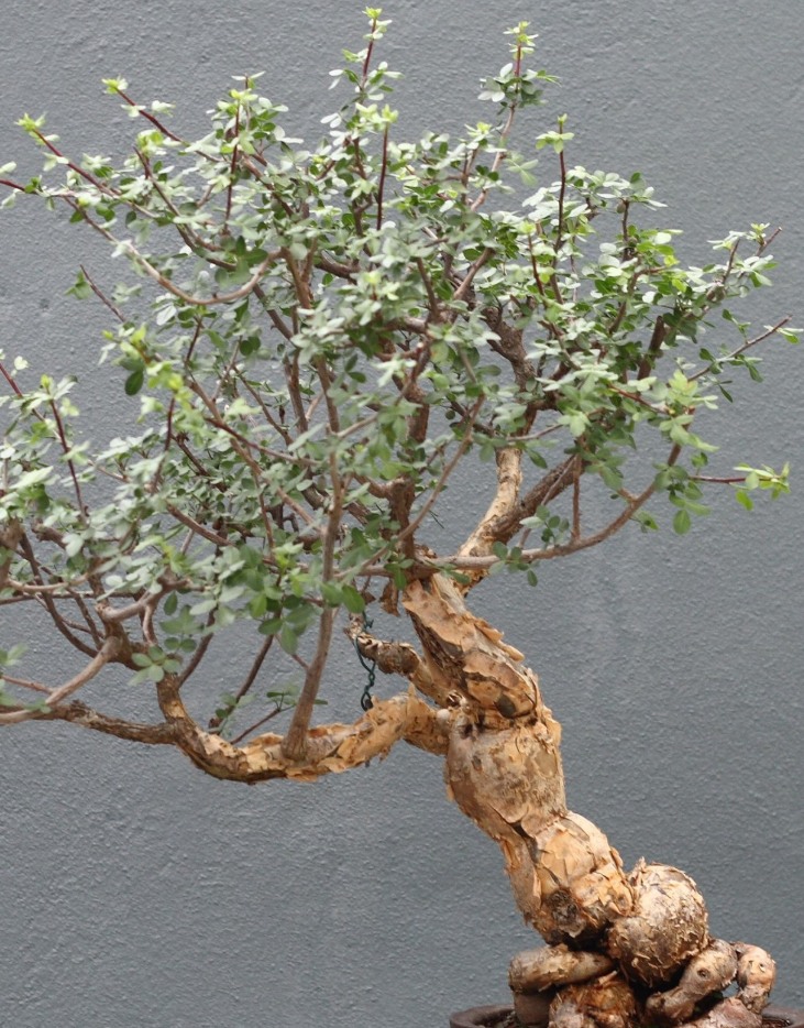 Is distinguished by its thick, twisted trunk and flaky, peeling bark that reveals a smooth, coppery layer underneath. This small tree or shrub thrives in arid climates, its leathery leaves and resinous scent adapting well to drought conditions. The tiny flowers, though inconspicuous, contribute to its allure. Its resilience and unique bark texture make it a standout in its native xeric landscapes.