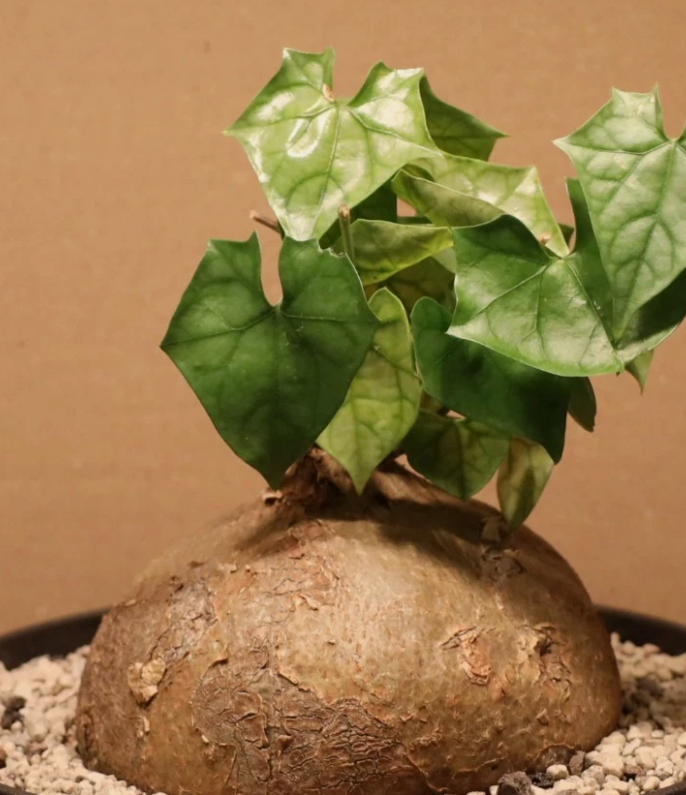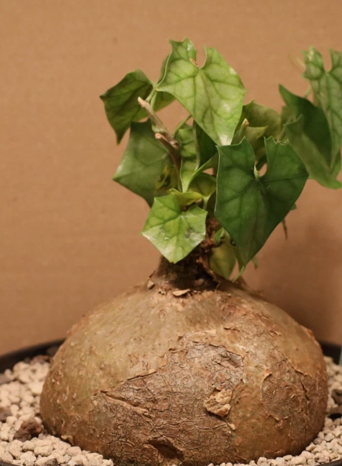 It is a perennial climber, expanded at the base into a succulent pumpkin-like caudex, usually about 30-40 cm in diameter. The smooth, alternate leaves are ivy-shaped, shiny and prominently veined. The Bigfoot has small, dark brownish-yellow orchid-like flowers.