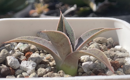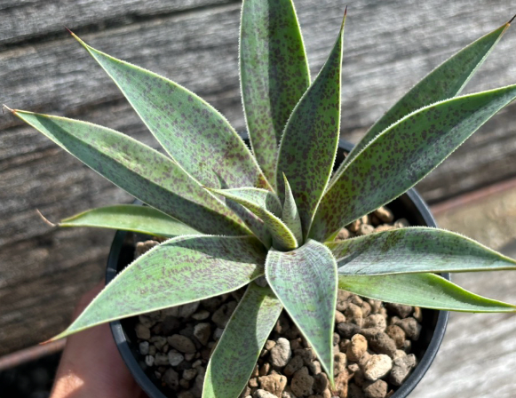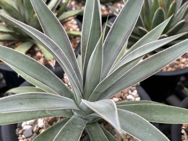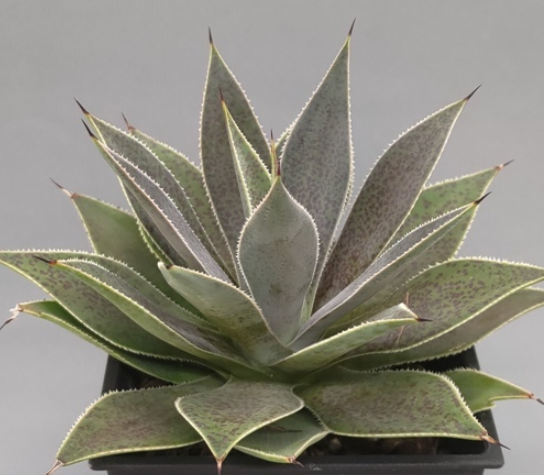A slow-growing, rosette-forming evergreen perennial succulent with fleshy dark grey-green leaves with pointed ends and spiny margins which become more purple-red at the top of the rosette.