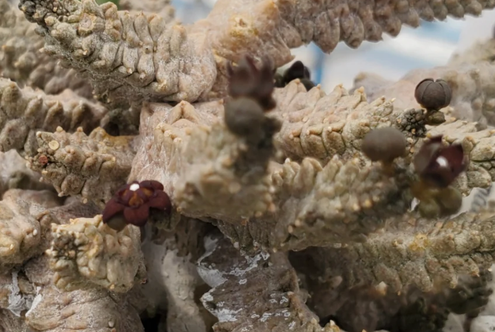 This minuscule plant, with thin, rough-tubercled, cylindrical stems looks nothing like the other species, it branches from an early age, six months or so, and its fruits (horns) are small but numerous, adorning almost every shoot.